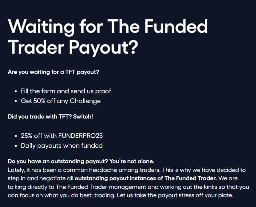 FunderPro is a prop firm from Malta that has a solution on how to get The Funded Traders payouts. They offer to help and negotiate on your behalf with The Funded Trader management and get your outstanding payouts approved. There is also a 50% discount on the FunderPro challenge if you are waiting on TFT payments and 25% if you are a TFT funded trader. This is what they stated on their website: